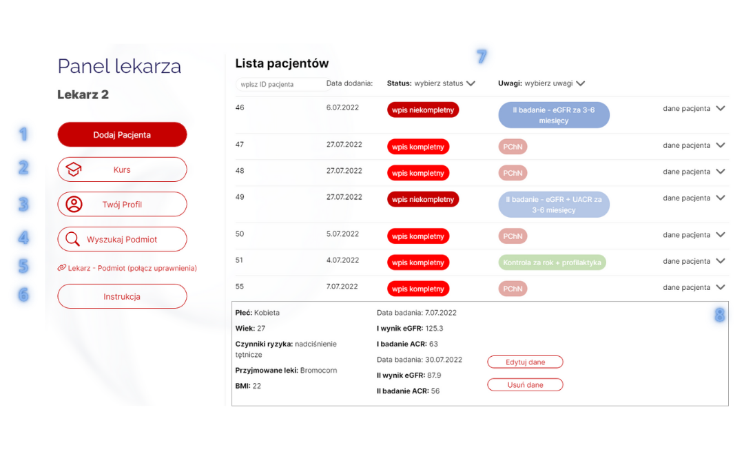 - W zależności od wyników badań i danych zdrowotnych pacjentów przypisanych do konkretnego lekarza, automatycznie wybrane zostaną dla nich stosowne konfiguracje badań koniecznych do realizacji. Lista prezentuje podział grupy pacjentów ze względu na przypisaną konfigurację zaleconych badań. Jeżeli jakiekolwiek konieczne dane pacjenta nie zostaną wprowadzone do systemu, zostanie on przypisany do kolumny “Badanie nieukończone”.