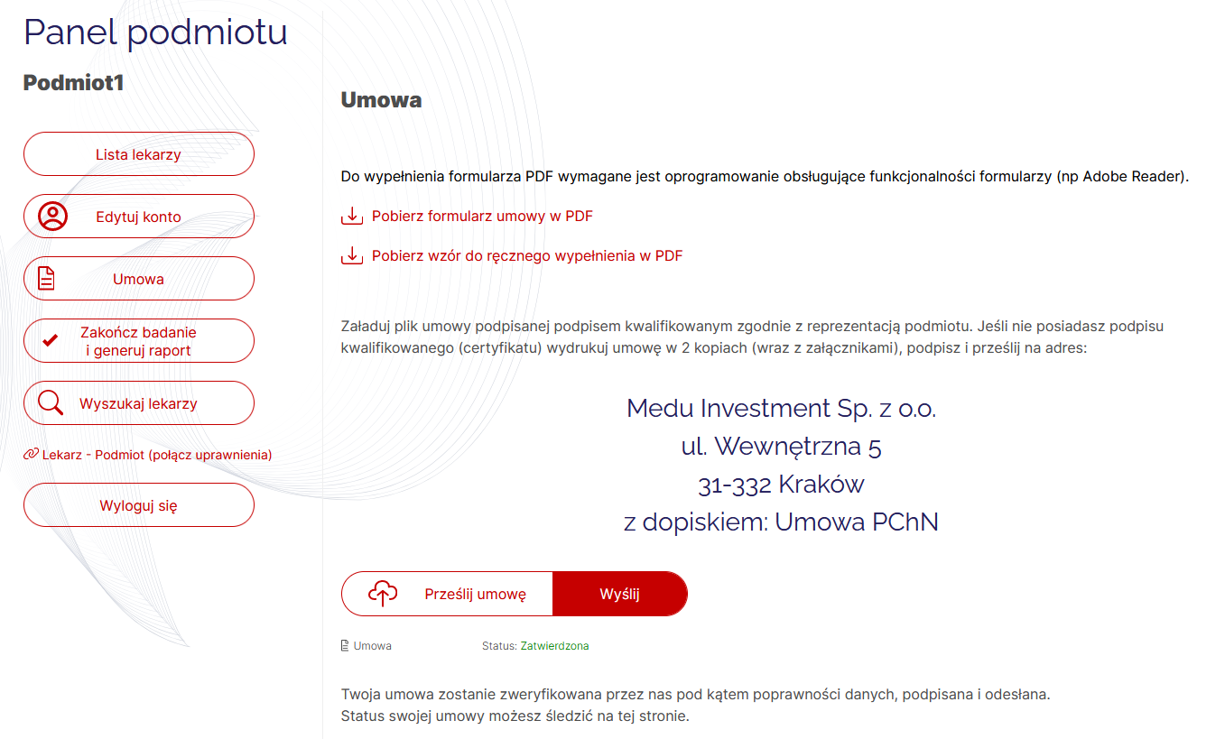 Uprzejmie informujemy, że zastrzegamy sobie 7 dni roboczych na zapoznanie się z umową wgraną przez przedstawiciela podmiotu medycznego. Po tym czasie drogą mailową wysłana zostanie informacja zwrotna na temat umowy wraz z jej podpisaną wersją (w przypadku prawidłowego uzupełnienia). Jeżeli zaistnieje konieczność naniesienia korekty będziemy się również kontaktować drogą mailową (na adres email wskazany podczas rejestracji podmiotu medycznego).